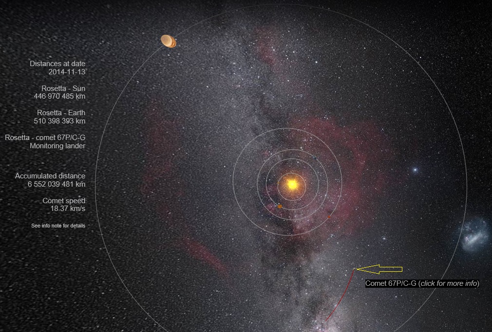 Presently 67P is located between Jupiter and Mars, on its swing towards the sun. To give you an idea how far out it’s located in the solar system, it takes over 28 minutes for radio communications from Rosetta to reach Earth. Therefore if mission control sends a comment to Rosetta, the results are only known one hour later!