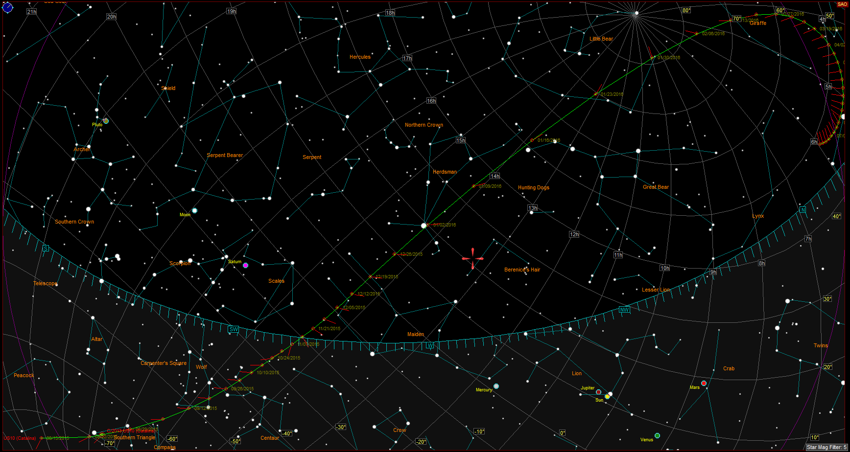 There’s a bright comet in the sky, currently at magnitude 6 and predicted to brighten to 5 by November. Not yet visible in the Northern Hemisphere, but just as it peaks in brightness towards the end of November, it will start showing up in the early morning sky, gradually rising earlier every day until late January 2016