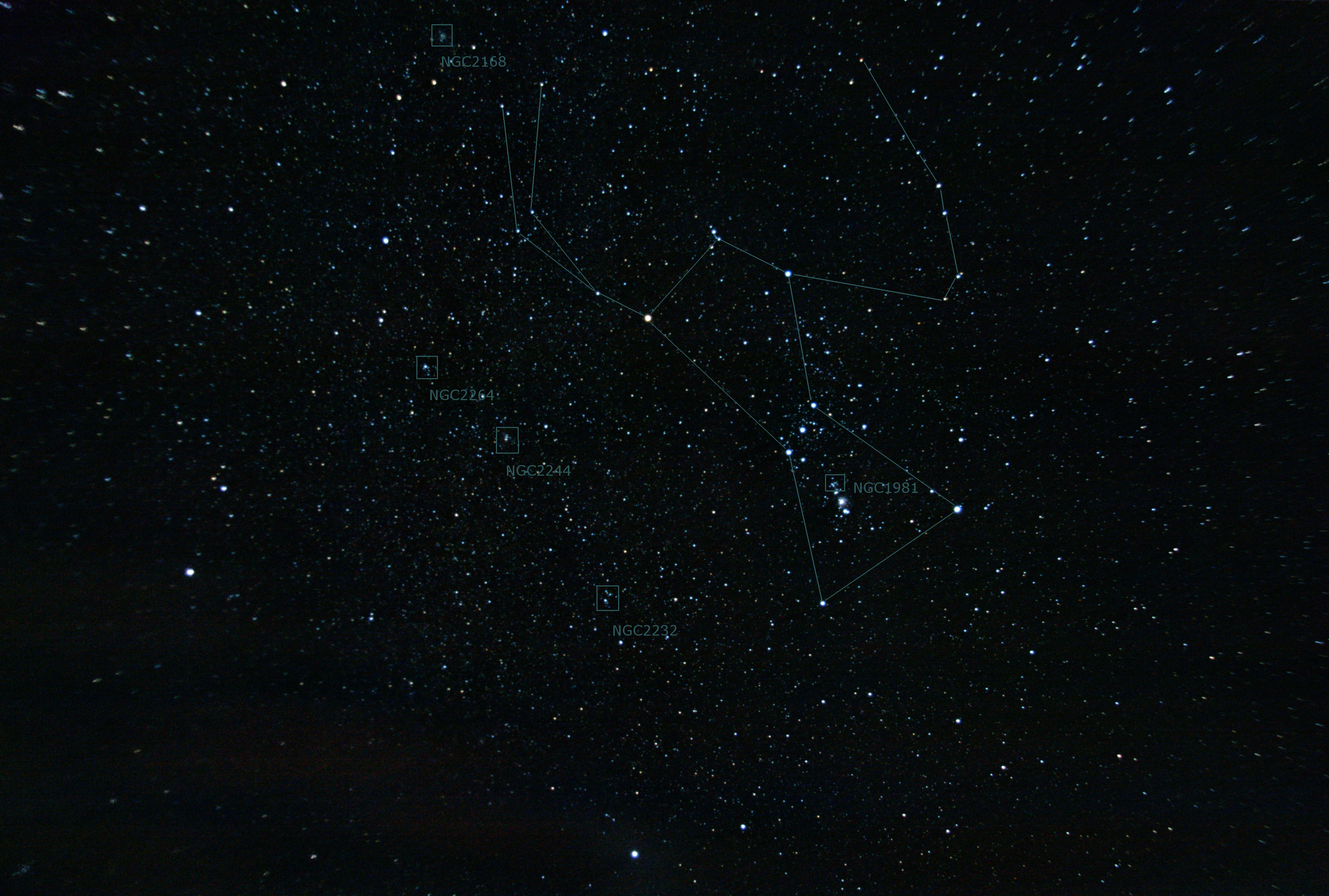 You don’t need much to enjoy the sky around Orion; binoculars, a camera on a tripod or a small telescope can reveal different objects in the sky. On the photo below [click to enlarge] I’ve identified five open clusters that show up on my photo even with a 17mm lens, hence should be easy targets for all types of equipment.
