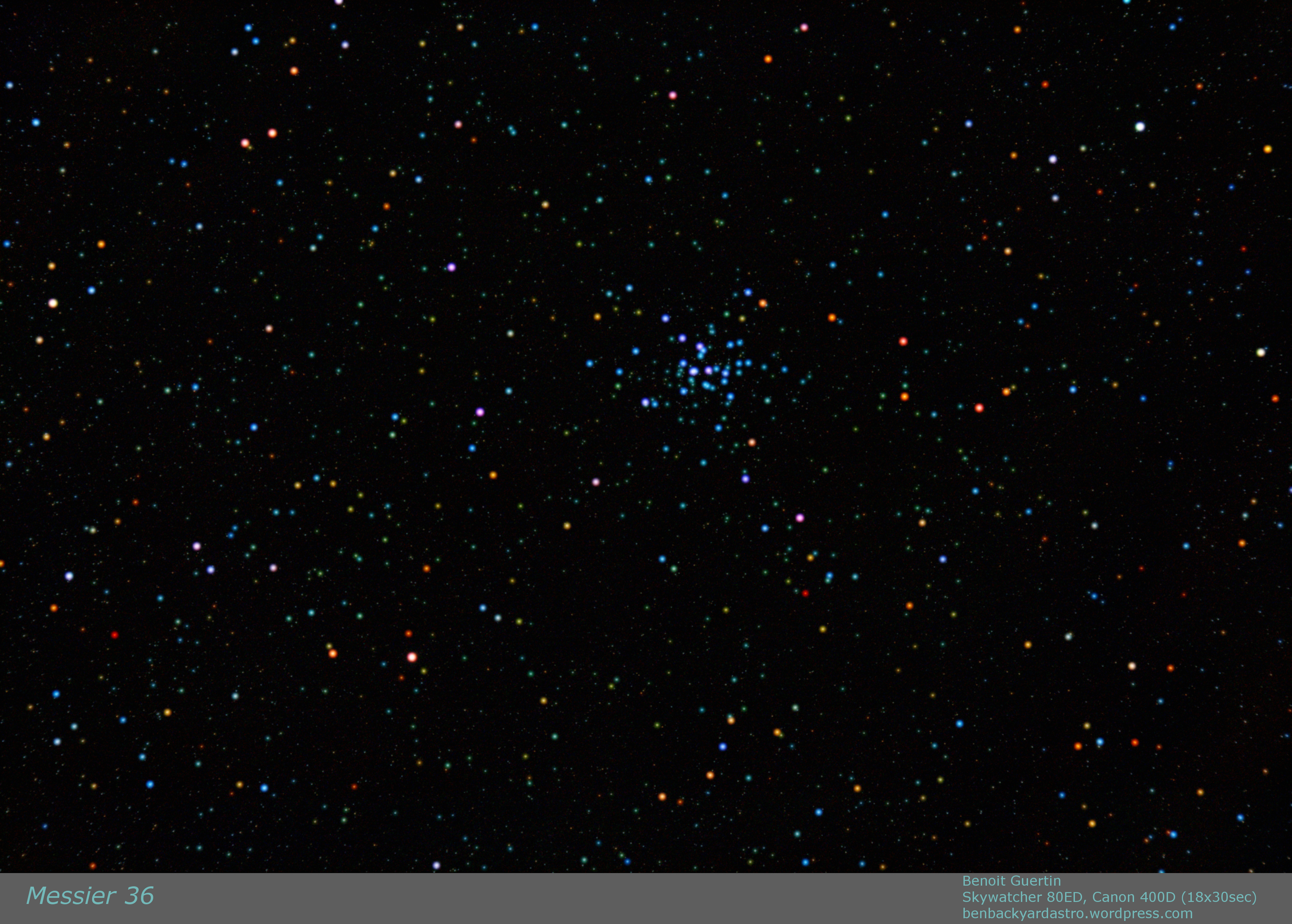 Open Cluster Messier 36 (NGC 1960) is located in the Auriga constellation. Located about 4,100 light years from Earth, and 14 light years across, it has at least 60 members. It is very similar to the Pleiades (M45) and if M36 was at the same distance (M45 is 10 times closer) it would be of similar magnitude. Two other open clusters from Messier’s catalog are located nearby: M37 and M38. The stars in the cluster are of spectral type B2, and fairly young: 25 million years.