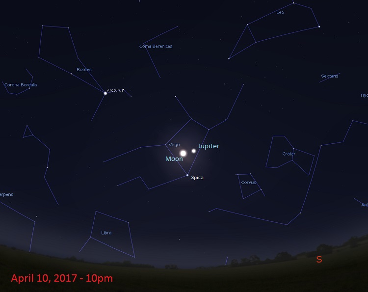 A good time will be on April 10th when the Moon will next to Jupiter. See the sky chart below showing the southern part of the sky at 10pm EDT. The planet will track west as the night advances.