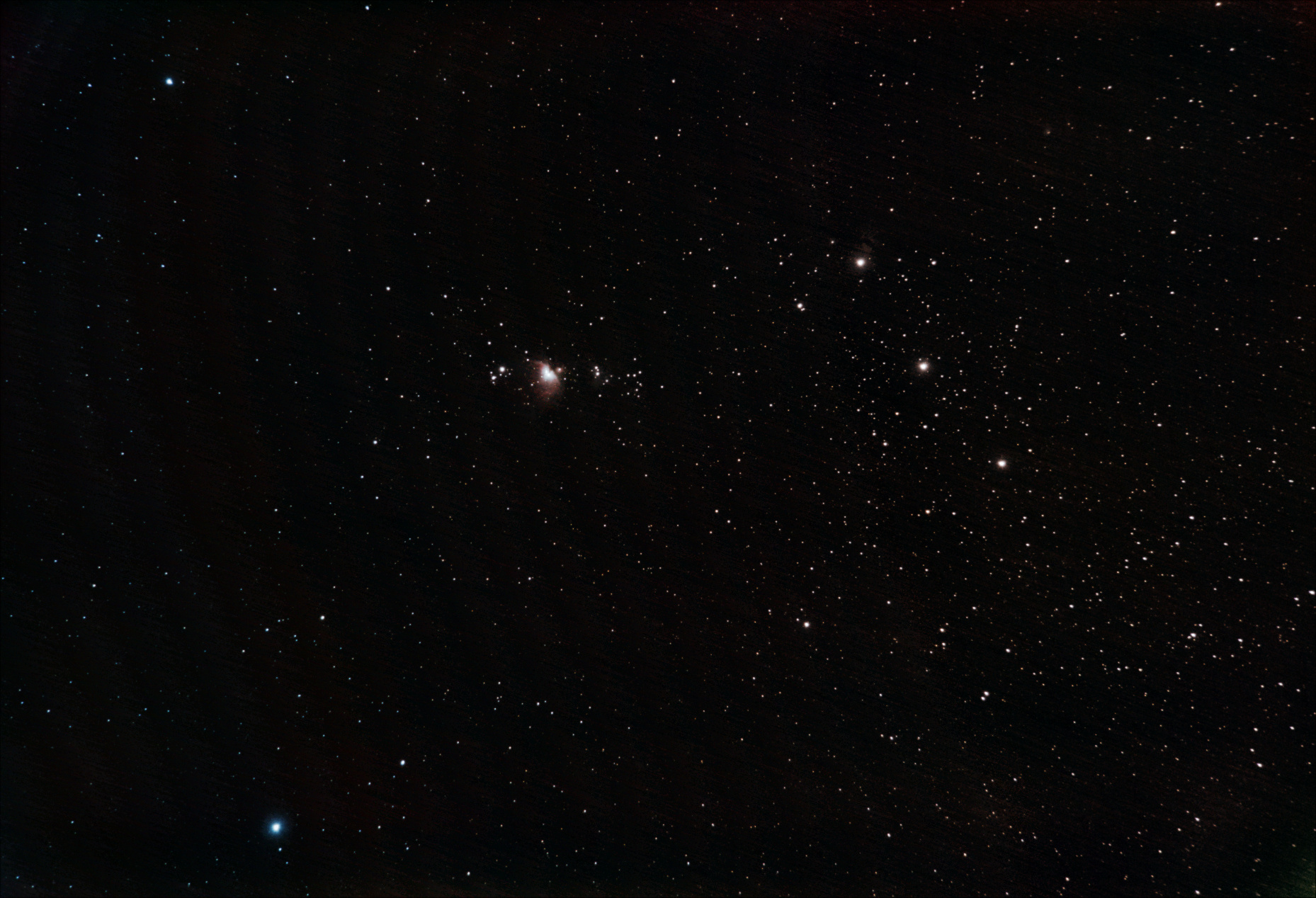 Below is a single 20 seconds exposure at ISO 800. The Orion nebula (M72) is just barely visible over the light pollution.